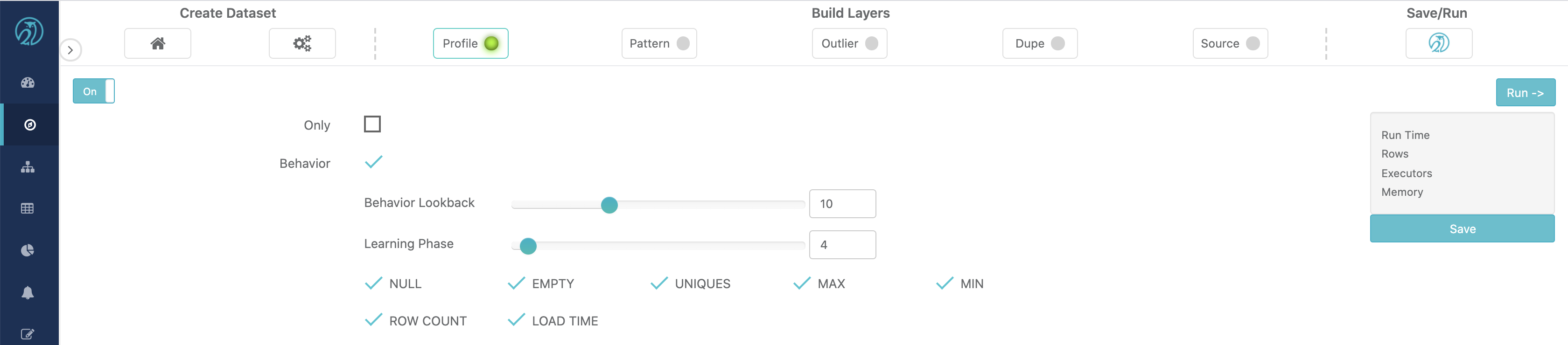 - Applicable Behavioral Factors - The user can choose to forego the application of any of the above factors to the scoring of the model. For example, the user can instruct Owl to not track MIN and MAX ranges of values in columns by unchecking the MIN and MAX checkbox. This would prevent Owl from detecting any extreme values in any column of the dataset using the Behavioral model.