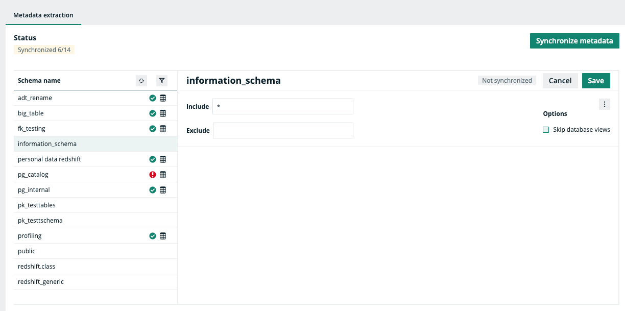You can see the schema list on the Configuration tab page of the Database asset page. - You can synchronize all schemas that have a table rule.