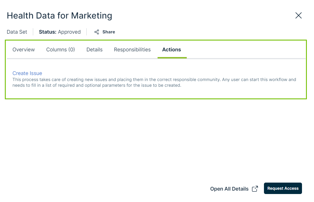 - If a data consumer does not have access to the workflow or the workflow does not apply to the asset type, the action will not appear.