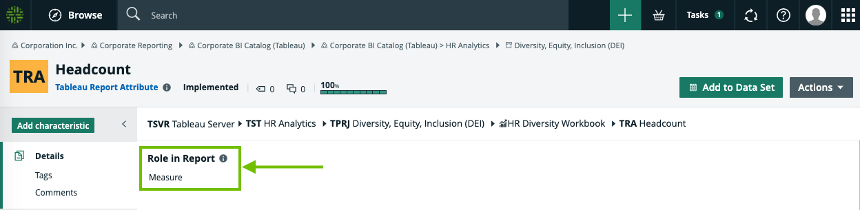 Now that both of the KPI assets linked to the Headcount report attribute are certified, return to the browser tab with the workflow task and click the checkbox next to Headcount.