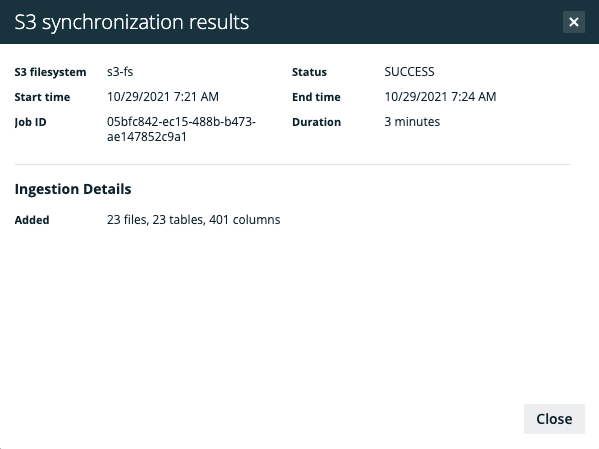 - In the row containing the S3 synchronization job, click Result.