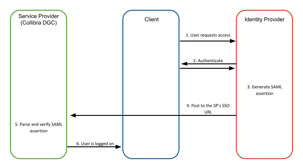 A type of sign-on that starts from the SP (Collibra). In this flow, the SP asks the IDP to authenticate the current user, using a SAML request. The IDP then returns a SAML response. This SAML response contains the assertion of the user currently visiting the SP. That assertion contains the properly configured attributes of the user that is requested. Note If the assertion's SubjectConfirmationData element contains the Address attribute, ensure that the value is a URL. This value indicates the expected network address of the client.
