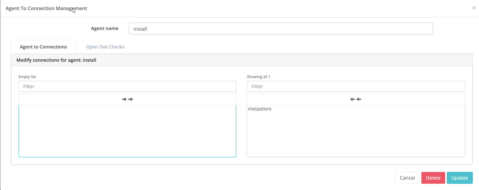 Double click the DQ Connection name to move from left to right. In Fig 5, DB Connection named "metastore" is being added to DQ Agent. Click the "Update" button to save the new list of DB Connections.Fig 5: Adding DB Connection named "metastore" to the DQ AgentFig 6: How to add all connections to the selected DQ Agent