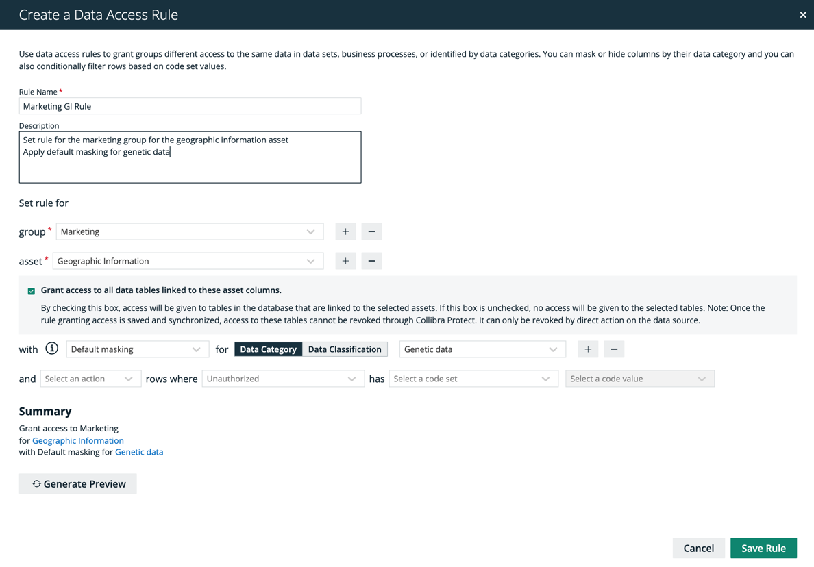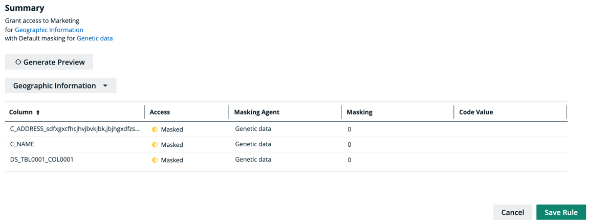 Tip Use the preview to verify the data access rule is set up correctly. The preview only shows the first 1,000 affected columns. The drop-down below the Generate Preview button is used to switch between the different selected assets in the rule. Each asset has its own preview table. -