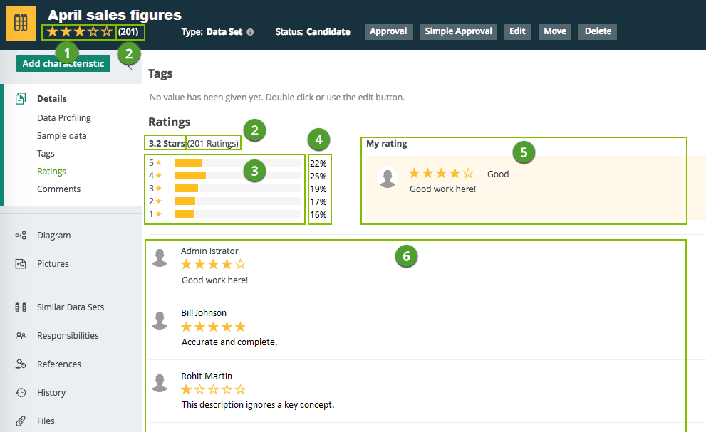Ratings information appears on the asset page of any asset with one or more ratings.