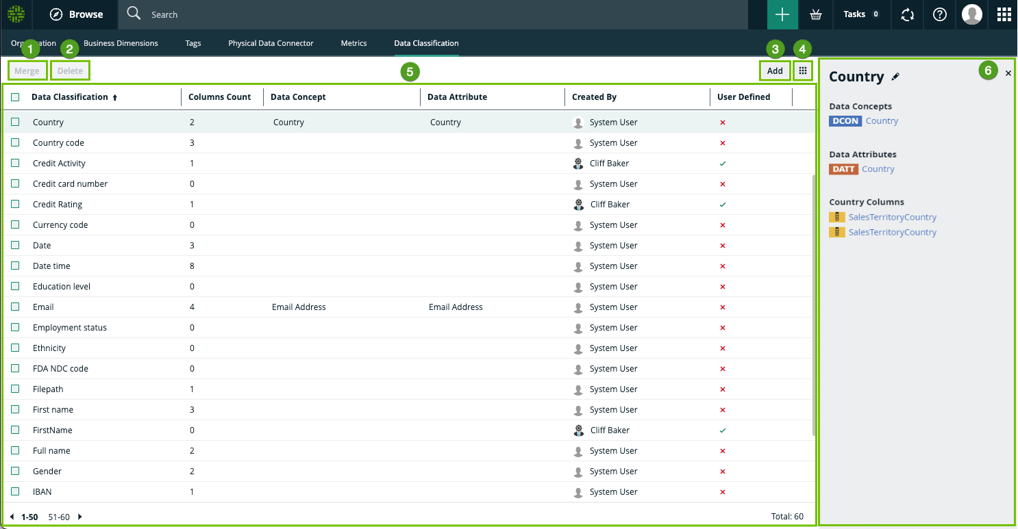 The Data Classification Dashboard shows the list of data classes in your Collibra environment and gives you more control and visibility on them.