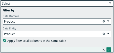 The Data Attribute asset linked to the Column asset via relation type "Data Attribute represents / represented by Column". When you filter on a Data Domain or Data Entity, the other drop-down lists dynamically update to only show content that relates to your filter. You can select the Apply filter to all columns in the same table checkbox to use the same filters to link a Data Attribute to other Column assets in the same table.