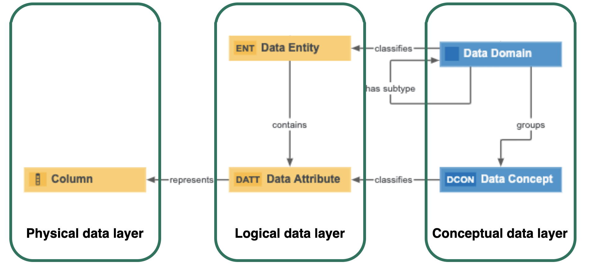 - Business Dimension (Data Domain) classifies / is classified by Asset (Data Entity)