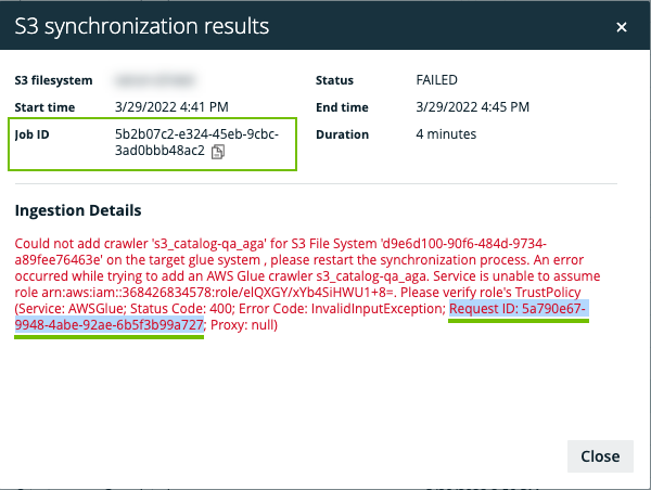 The S3 synchronization results dialog box includes the Job ID. When an S3 synchronization fails, the results includes a detailed error message with the Request ID.