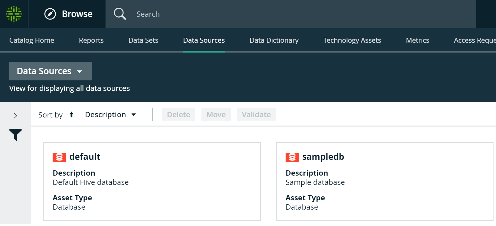 The Data Sources page is page that shows the asset types that are created by Database and S3 registrations. It’s a combination of Data and Technology asset types.