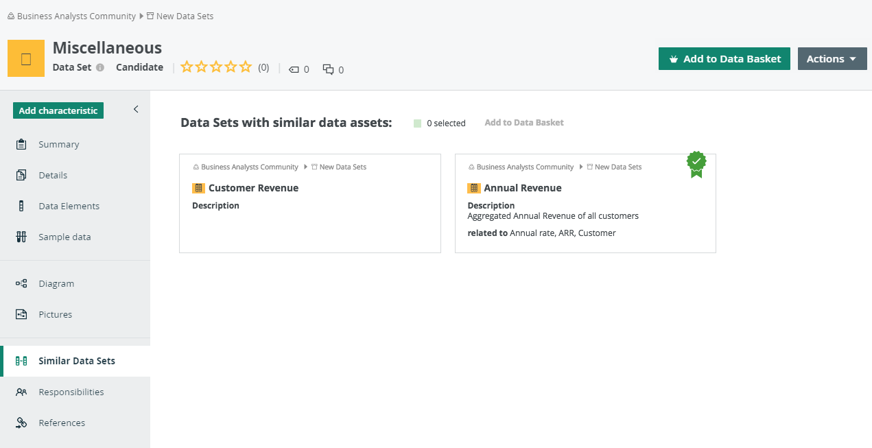 The data set matcher looks at the names and attributes of the column assets that a data set contains. It shows similar data sets on the data set asset page.