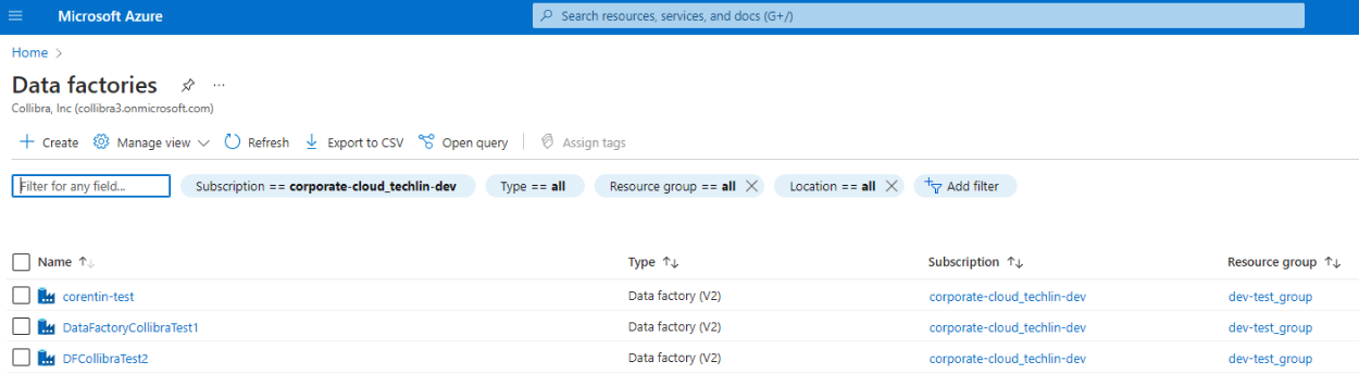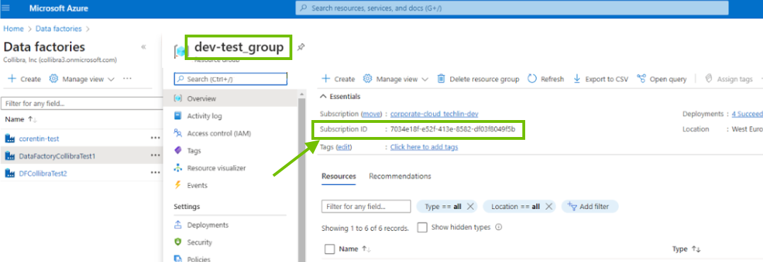 On the Data factories page, click the resource group for the Azure Data Factory instance for which you want to create a technical lineage, and make note of the subscription ID.