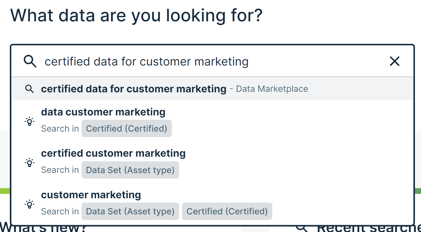 - The first suggestion is based on a recent search action. Clicking this suggestion launches the search for certified data for customer marketing in Data Marketplace again.