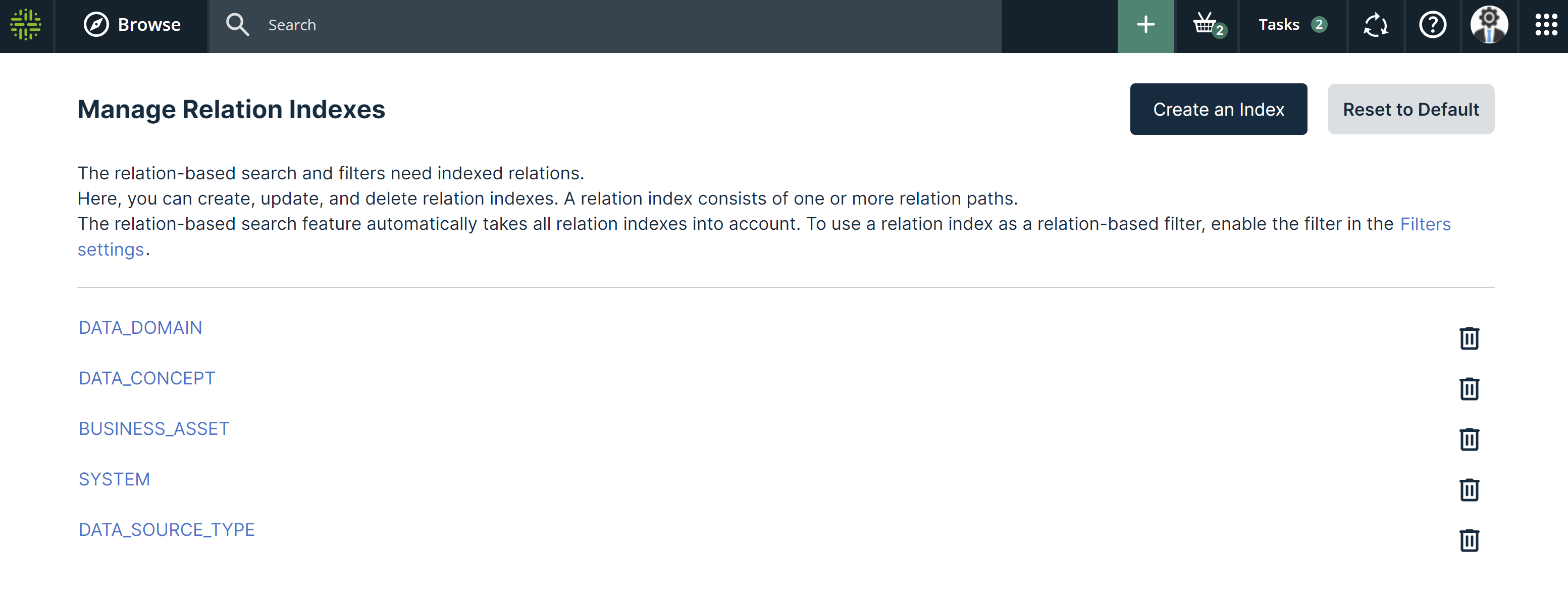 The Manage Relation Indexes page opens. It provides an overview of all relation indexes in the environment.