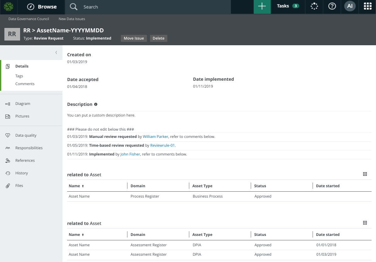 Let's say that a user finds the description of an approved Business Process asset to be misleading. The user manually triggers a review request and a Review Request asset is created. At this point: