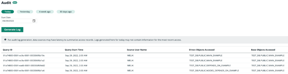 - The generation of an audit log may take up to a minute. After clicking Generate Log, do not navigate away from the Audit page because doing so cancels the audit log generation.