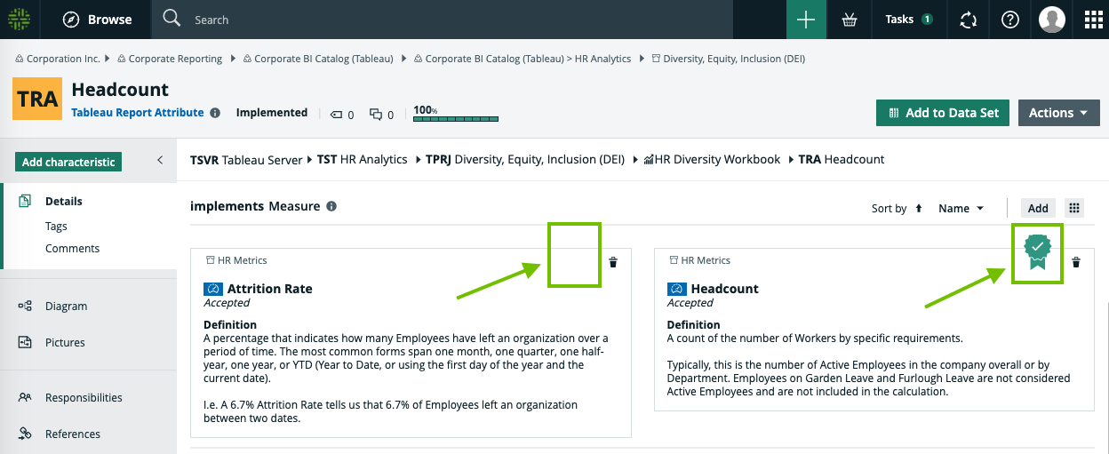 Now that both of the KPI assets linked to the Headcount report attribute are certified, return to the browser tab with the workflow task and click the checkbox next to Headcount.