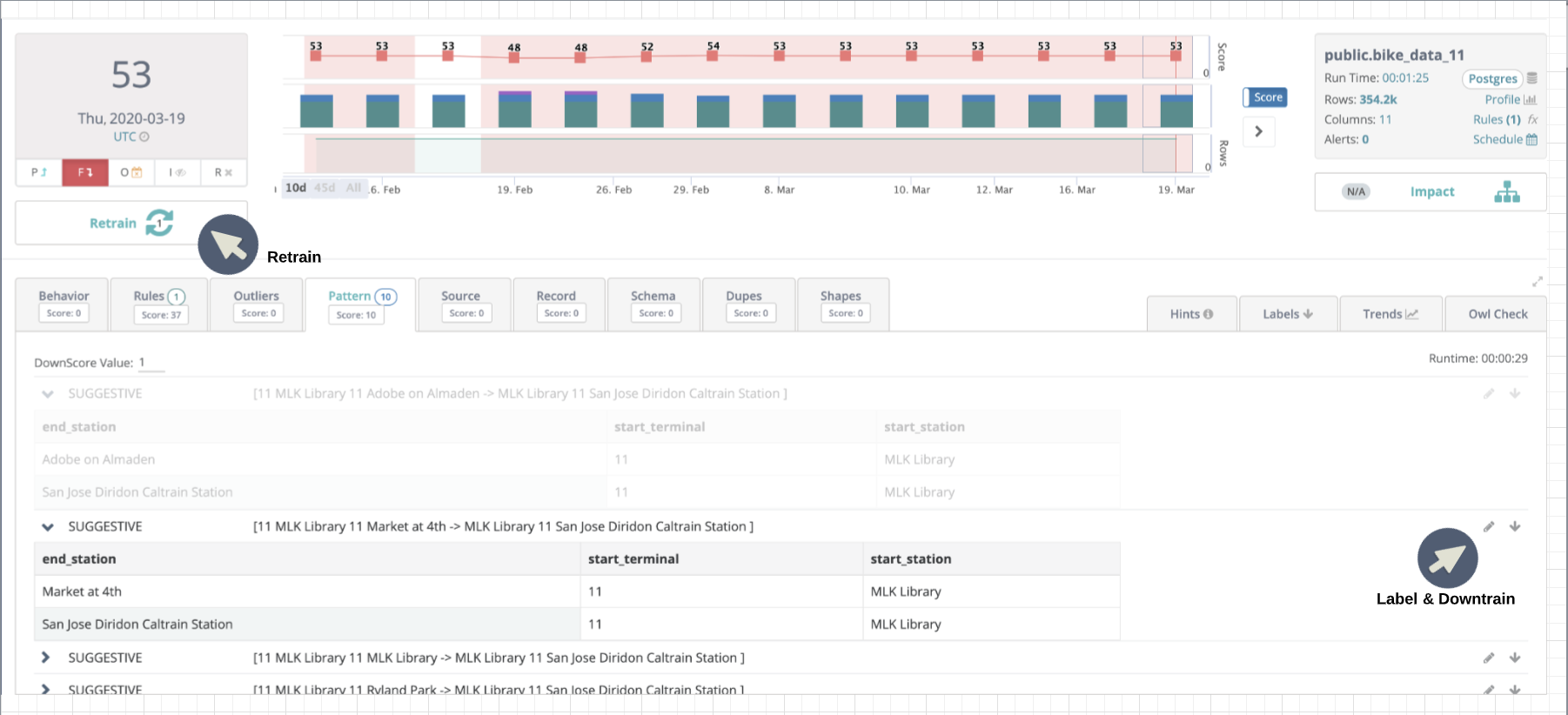 It is possible that an apparent anti-pattern finding is actually valid data and not a data quality issue. In this case, DQ allows the user to further instruct the existing Patterns model on how to properly score and handle the findings. For example, if it turns out that "Market at 4th" is actually a valid "end_station" for a bike trip, the user can negate the identified anti-pattern by labeling it as valid. This action instructs DQ to not raise this particular anti-pattern again. DQ also rescores the current Owlcheck results to reflect the user's feedback. In addition, it is possible to define the weight of an anti-pattern finding on the current dataset by setting the numerical value to deduct per finding.