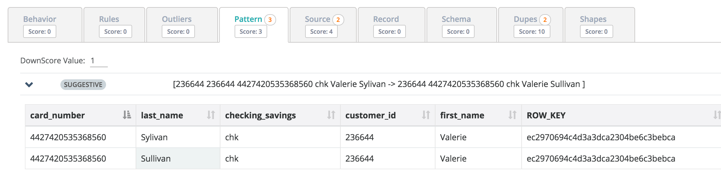 Owl uses the latest advancements in data science and ML to find deep patterns across millions of rows and columns. In the example below it noticed that Valerie is likely the same user as she has the same customer_id and card_number but recently showed up with a different last name. Possible misspelling or data quality issue?