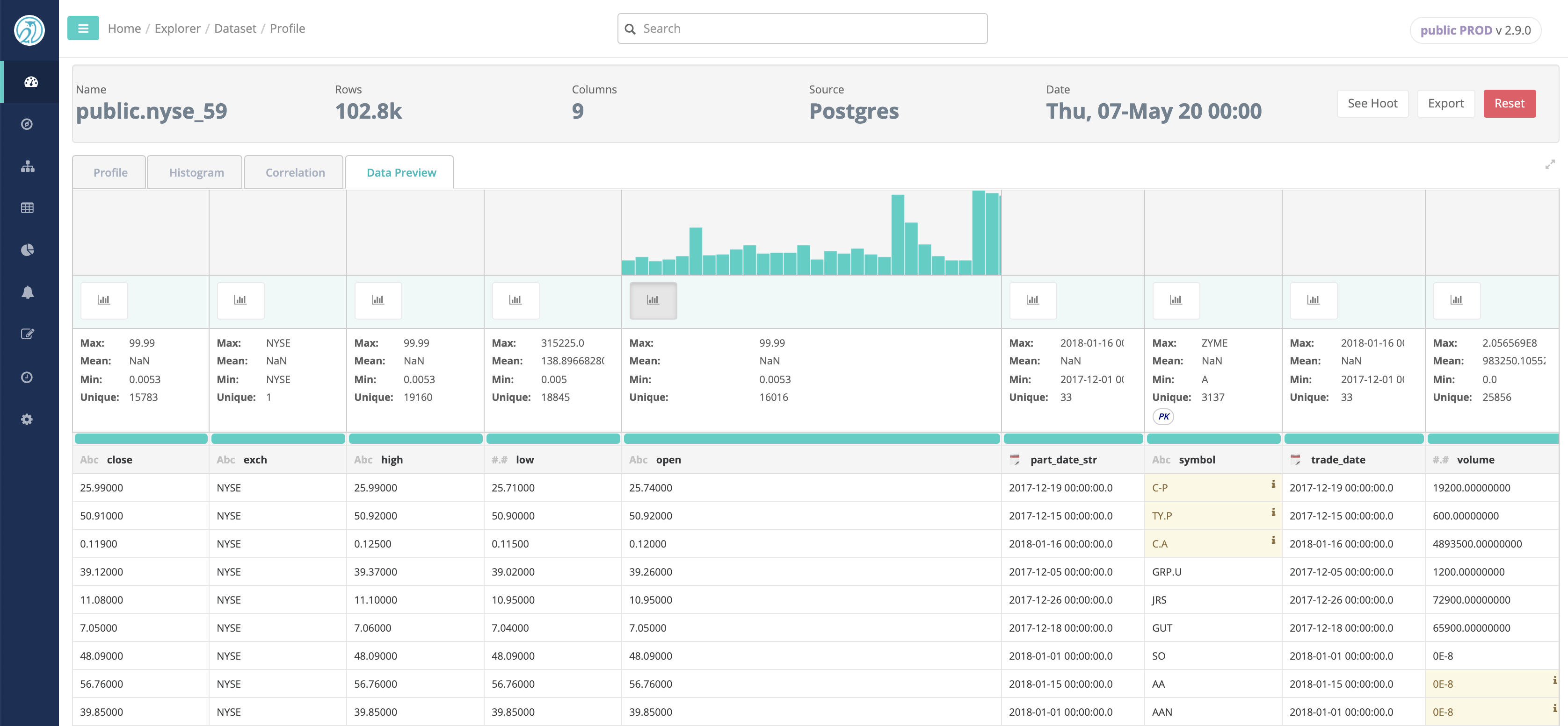 After profiling the data, for those users with appropriate rights, Collibra DQ provides a glimpse of the dataset. The Data preview tab also provides a some basic insights such as highlights of Data Shape issues and Outliers (if enabled), and Column Filtergram visualization.
