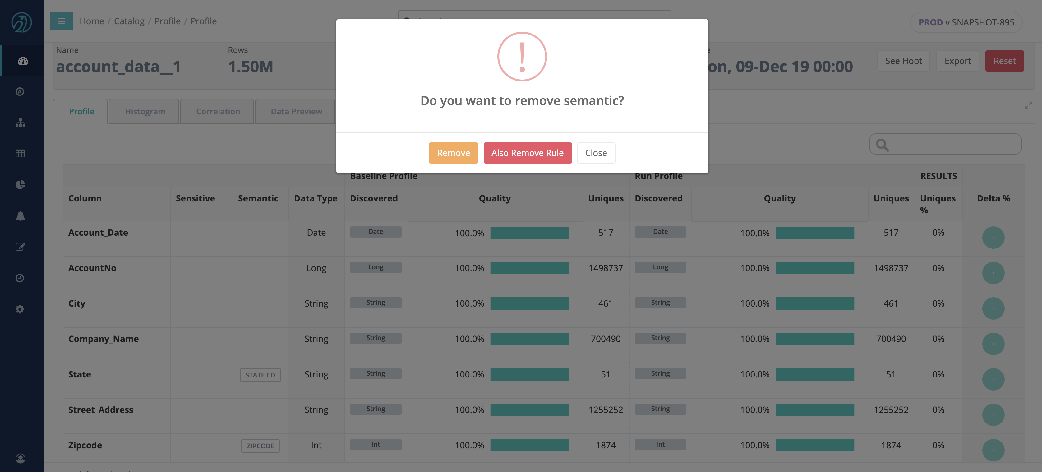Once detected, Collibra DQ tags the column in the Profile as the discovered type and automatically applies a rule. You can choose to decline any discovered tag by clicking on it and confirming the delete action. This action also removes the rule associated with the tag.