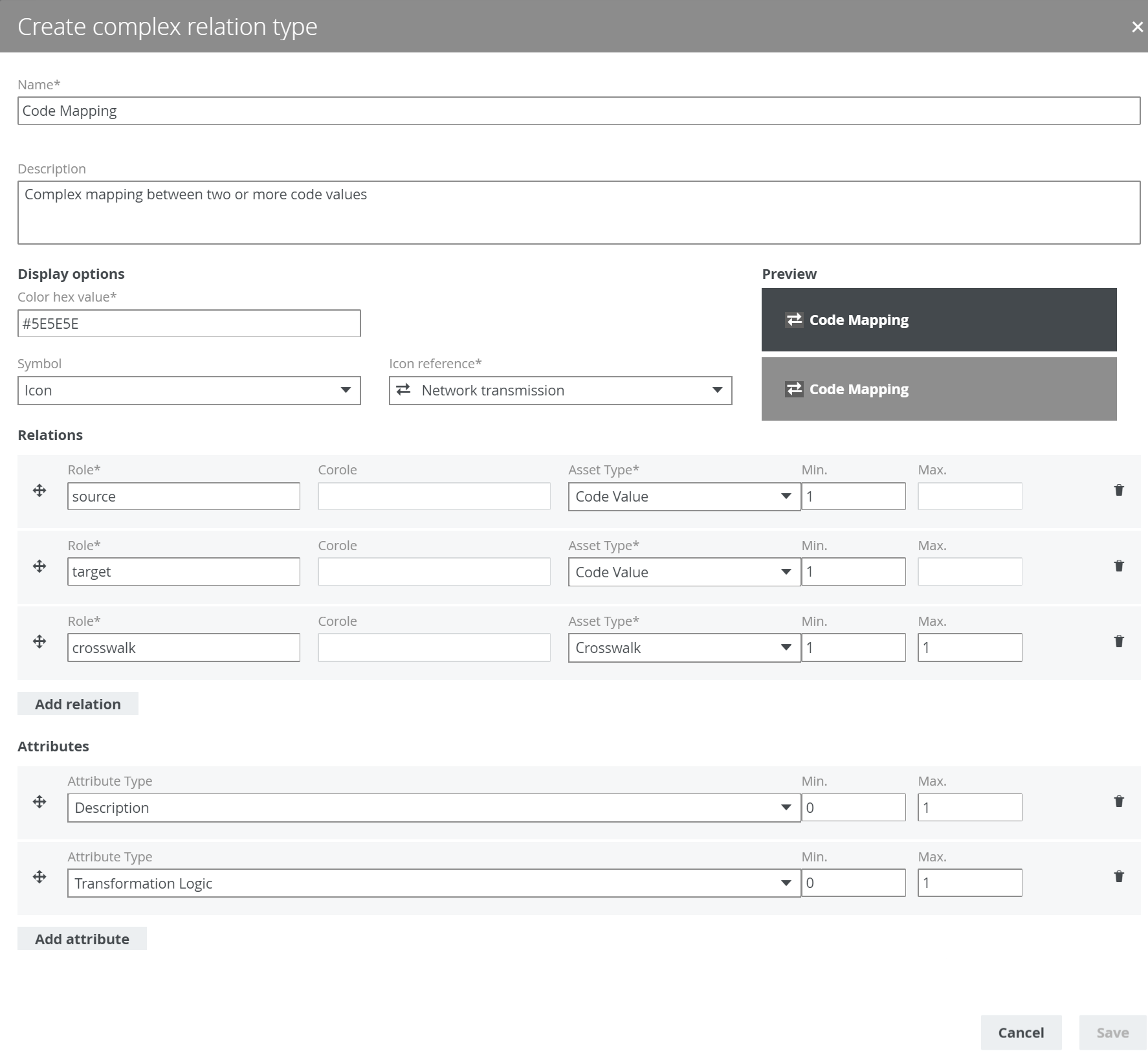 The following example creates a complex relation type called Code Mapping, with three relation types (source, target and crosswalk) and two attribute types (Description and Transformation Logic).