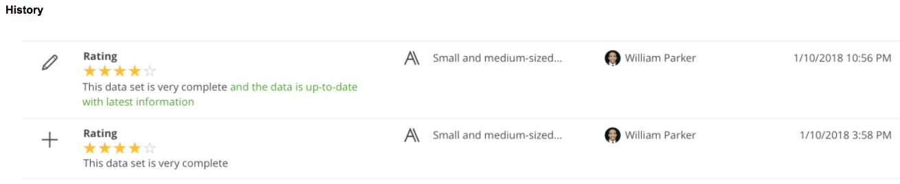 User ratings and any edits to, or deletions of, ratings are shown in the History tab page of the relevant: