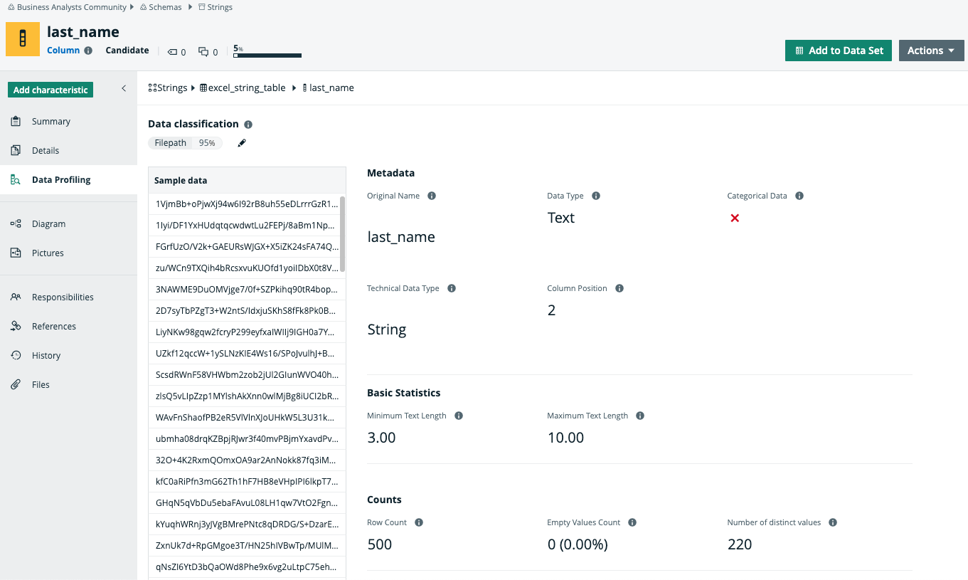- Collibra anonymizes the content of columns with data of the type Text and Geo immediately at the end of the profiling process. As a result, data samples and the values that are shown in the data distribution charts are replaced by a random hash value for columns that contain these data types. Attributes that could contain sensitive data, like attributes of the type Mode or Percentiles, are no longer calculated for columns with data type Text or Geo.