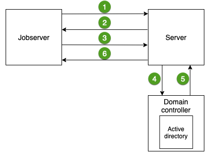 When you ingest a Microsoft SQL Server data source using NTLM authentication, the Jobserver connects to the server to request access. The server then sends a challenge for the Jobserver to encrypt and send back. The domain controller validates that response and gives the Jobserver access to the data source.