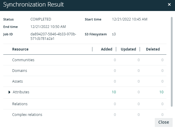 After you synchronized Amazon S3, you can view the summary of the results. This shows the impact of the synchronization on the assets in Collibra Data Intelligence Cloud