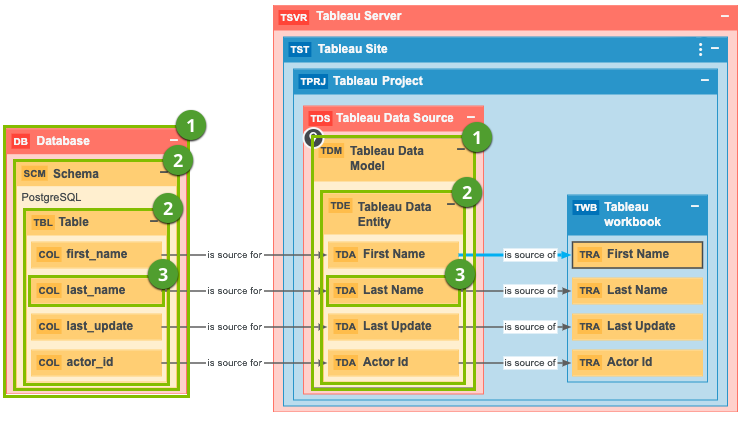 - A relation of the type "Technology Asset source system for / source system Data Asset" type between the Database asset and the Tableau Data Model asset.