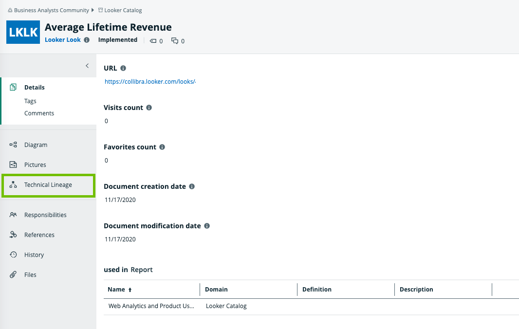 When you ingest Looker metadata, you automatically create a technical lineage for Looker Look assets. If you have the right permissions to view the technical lineage, you can go to a Looker Look asset page and click the Technical lineage tab, which allows you to access the technical lineage.