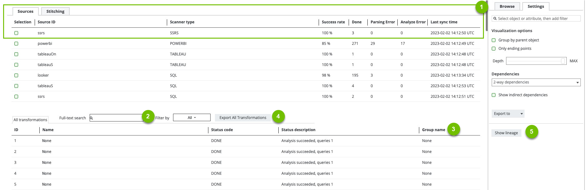 Checkboxes to filter on a data source in the transformations table. If you select none, the transformations table contains all transformations. |