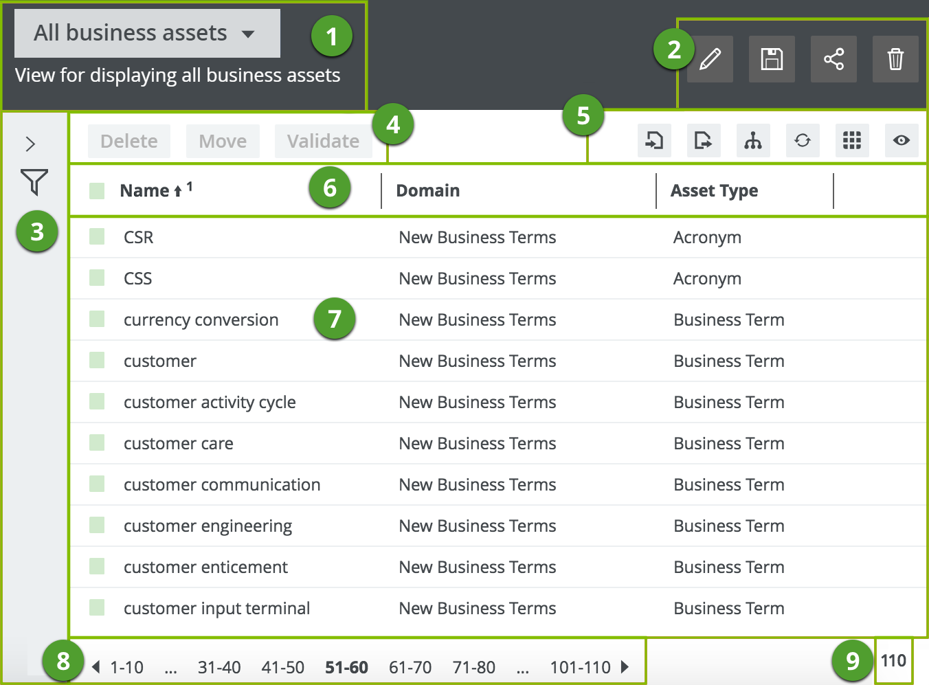 | 4 | Action menu | The action toolbar contains a selection counter and actions that you can perform on assets you select in the table. |