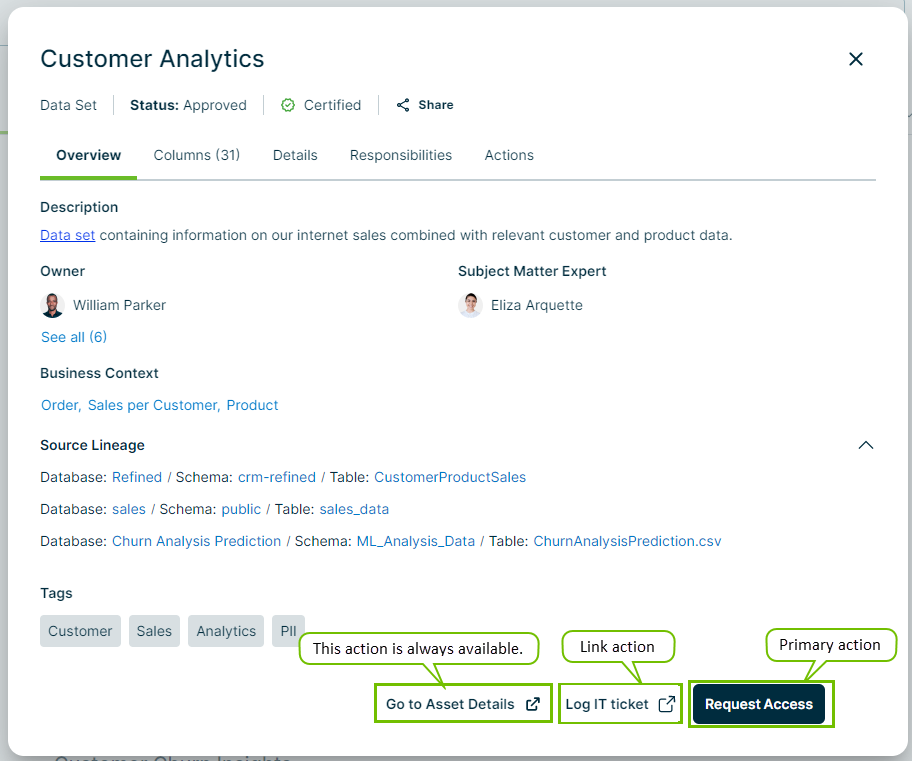 ExampleIn the below example, Request Access is the primary action and Log IT ticket is the link action. You cannot customize the Go to Asset Details action.