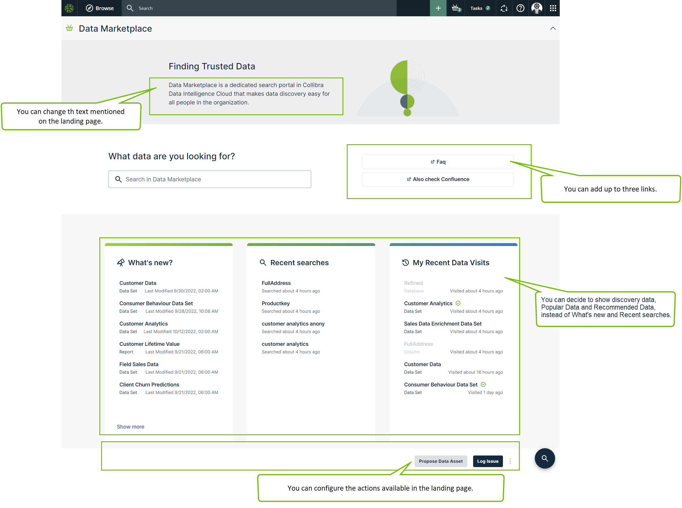 As an administrator, you can optimize the landing page. You can configure the quick links, introduction text, actions, and define whether discovery data must be available.