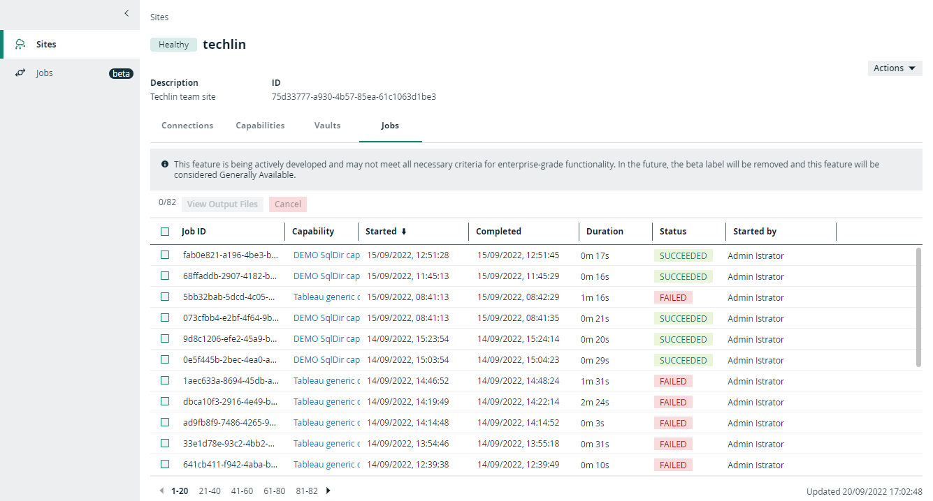 On the Edge Jobs dashboard, you find an overview of all jobs that have either been scheduled or completed in your Edge sites. Each job is a row in the table and contains basic information such as start and completion date, status, Edge site, capability and so on. You can also open the log files of a job and cancel a scheduled job from this dashboard.