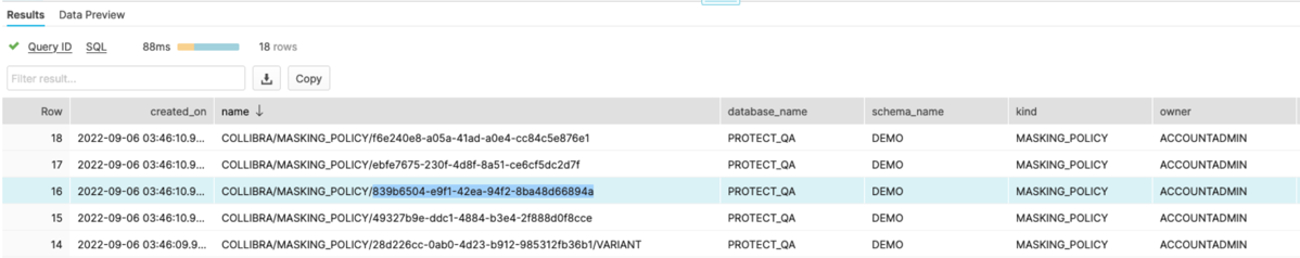 In Snowflake, each column that is categorized as Personally Identifiable Information within the Employee Data dataset inherits the masking policy that is applied to the column in Protect. The masking policies created at the schema level use the following naming convention: COLLIBRA/MASKING_POLICY/<asset ID>.