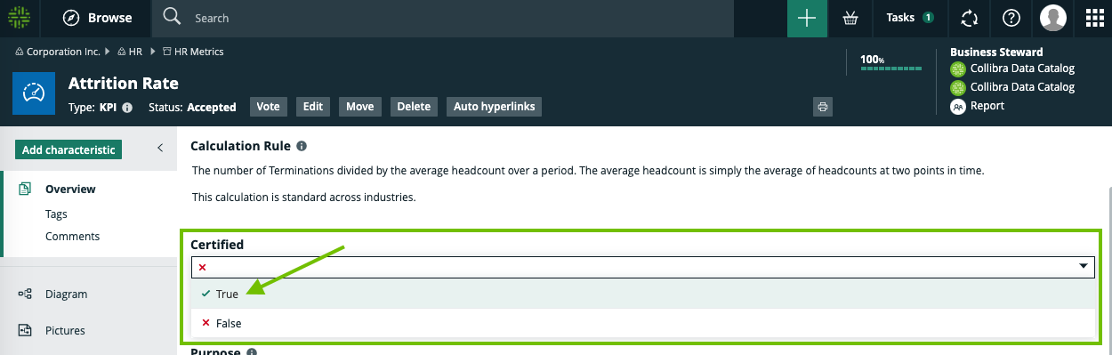The green certified ribbon indicates that the KPI Attrition Rate is now certified.