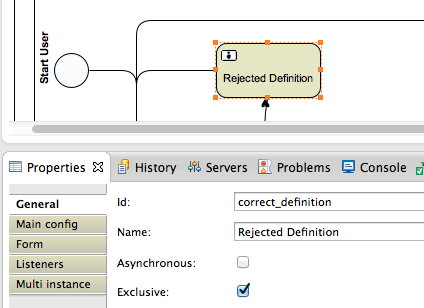 - Id: The ID of a user task has to be a unique task identifier within the workflow. For statistical purposes, you can add a prefix to an ID, which is then considered to be a 'task type'. Everything before the first underscore (_) is considered the task type. In the example below, the task type of the created user task is 'correct'. In this way, you can group similar tasks together and make it possible to get statistics about each individual task type. For example, I want to know the number of open 'review' tasks.
