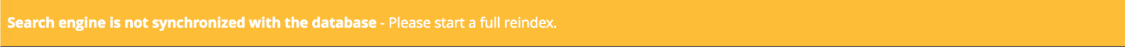 Users can still create, edit and delete resources; however, such activity will result in an asynchronous state between the Search service and the database. When the Search service becomes available again, if no resources were created, edited or deleted, there is no need to reindex Collibra. If, however, such changes were made in the environment, a full reindex is necessary. Your Collibra administrator is notified via a warning, as shown in the following image.