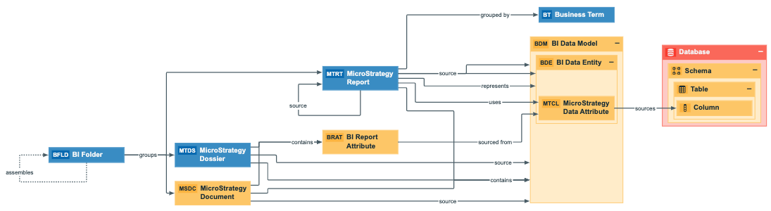 When you integrate MicroStrategy, Collibra Data Lineage creates new MicroStrategy assets and relations in Data Catalog. You can see them on the asset page overview or visualize them in a diagram.
