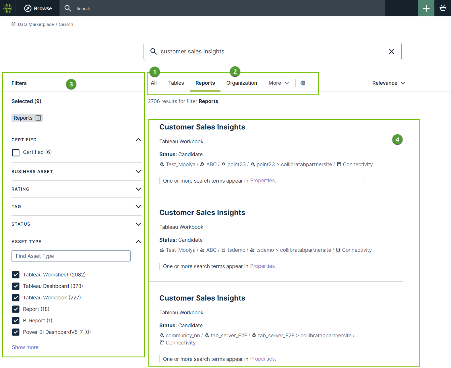 By default, Data Marketplace finds assets of all asset types, with any status, anywhere in your organizations. |