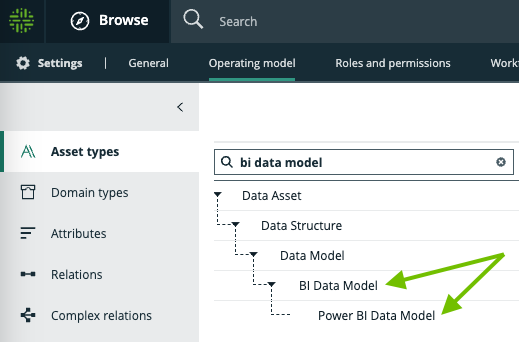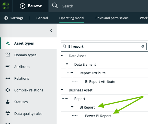 - Assets that represent the data set you used to create the report in your BI tool. These are assets of child asset types of the BI Data Model asset type, for example Power BI Data Model and Tableau Data Model assets.
