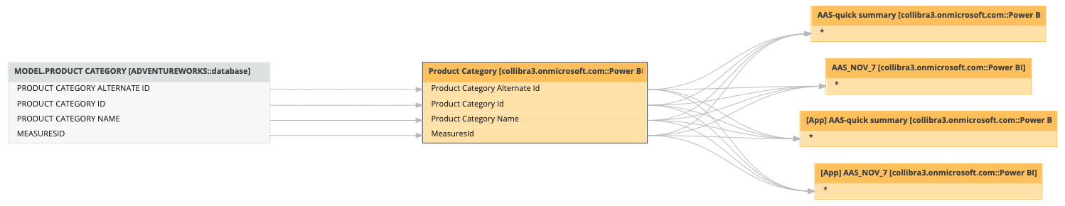 Go to the asset page of your BI Data Model asset and click the Technical Lineage tab. As shown in the following image, there will most likely be three nodes or groupings of nodes: