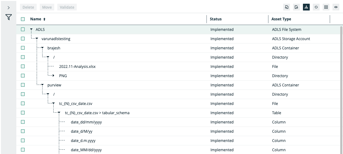 This table shows the metadata for each ADLS asset type.