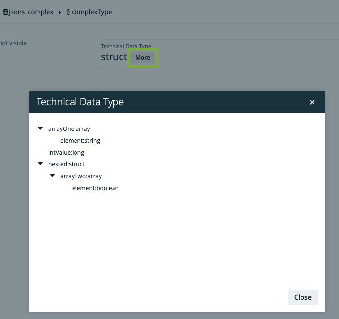 For columns that have a structured technical data type, Array or Struct, you can click the button in the Column asset to see the structure of the data in a dialog box. |
