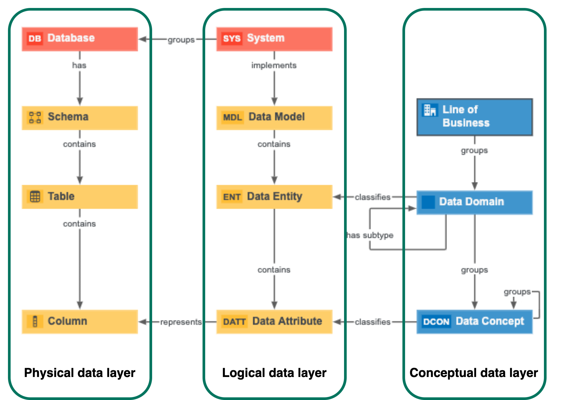 - The conceptual data layer represents the overarching structure of objects and elements in your data landscape.