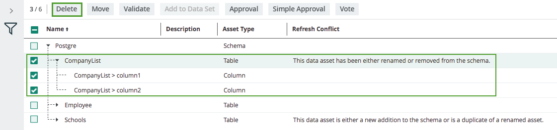 In the following example, the original schema Postgre contains the table Employee and the table CompanyList. A new table Schools has been added to the schema and the table CompanyList has been deleted. After refreshing the schema, refresh conflicts appear for the added table and the deleted table, as shown in the following image: