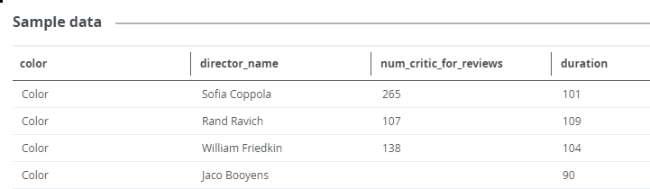 Sample data is a set of randomly collected data from a data source. Sample data can be displayed for Table, Column, or Data Set assets. The purpose of showing sample data is to provide examples of the data so you know what to expect when you use the asset.